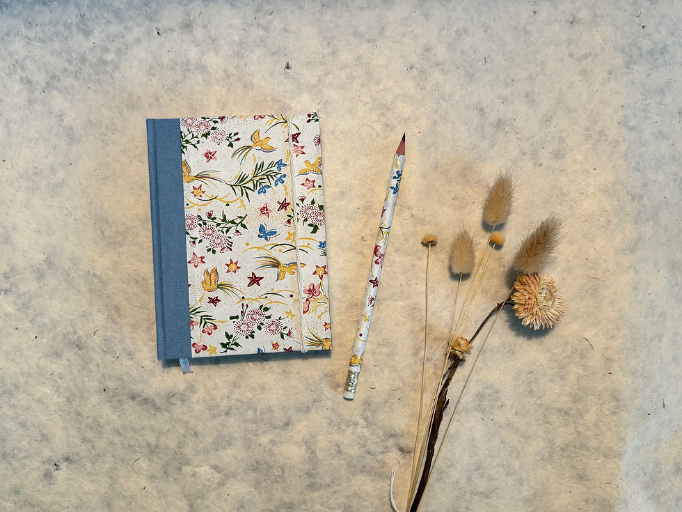 Décoré avec les chutes de papier lokta (naturel et artisanal) qu'il me reste de la fabrication de mes carnets, il est assorti aux carnets que je vends.